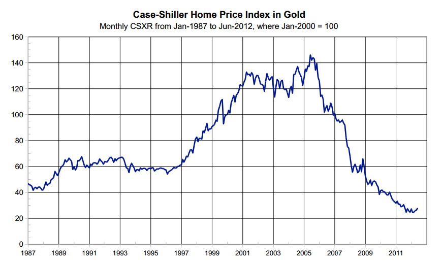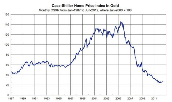 And real estate? As we’ve said before, productive real estate from which you can live independently is a great idea. All other real estate is a very bad bet from a financial point of view. Since the real estate bust began in 2006, as retorts to our advice to sell, we have been hearing: Yes, real estate has gone down, but not in my state. Which was then replaced by: Yes, real estate has gone down, but not in my area. Which has been replaced by: Yes, real estate has gone down, but not in my neighborhood. Here’s the chart of US Real Estate priced in gold going back to 1987: