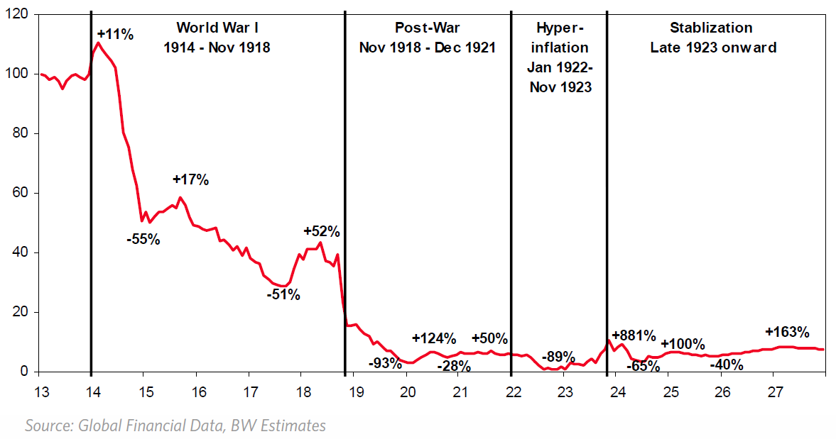 In other words, to local people using the local currency, they felt like their money was increasing in value in stocks. The Zimbabwe stock index chart during the recent Zimbabwe hyperinflation looked even better. Stock index charts always looks like this or better when calculated in the local over-printed currency. But here’s what those Weimar stocks looked like to the rest of the world, a world that was still on the gold standard to some degree at the time:
