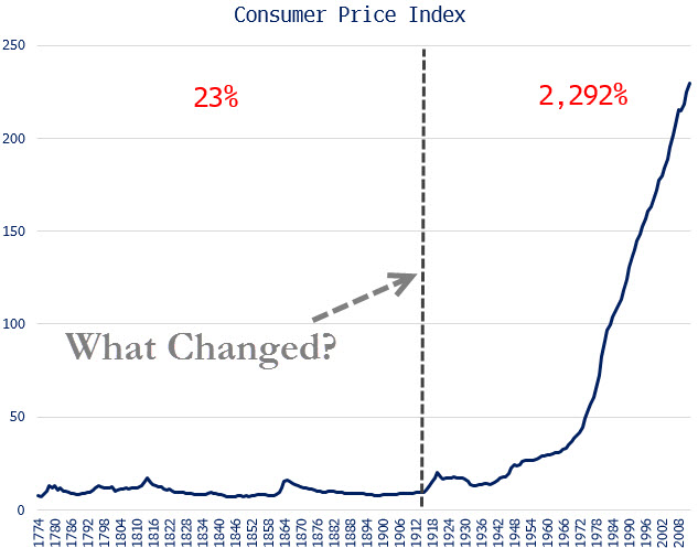 As this chart shows, the US Consumer Price Index was remarkably steady until the creation of the Federal Reserve in 1913. It has been on an explosive upward path ever since, leading most people alive today to believe that inflation and price increases are normal. They are not!