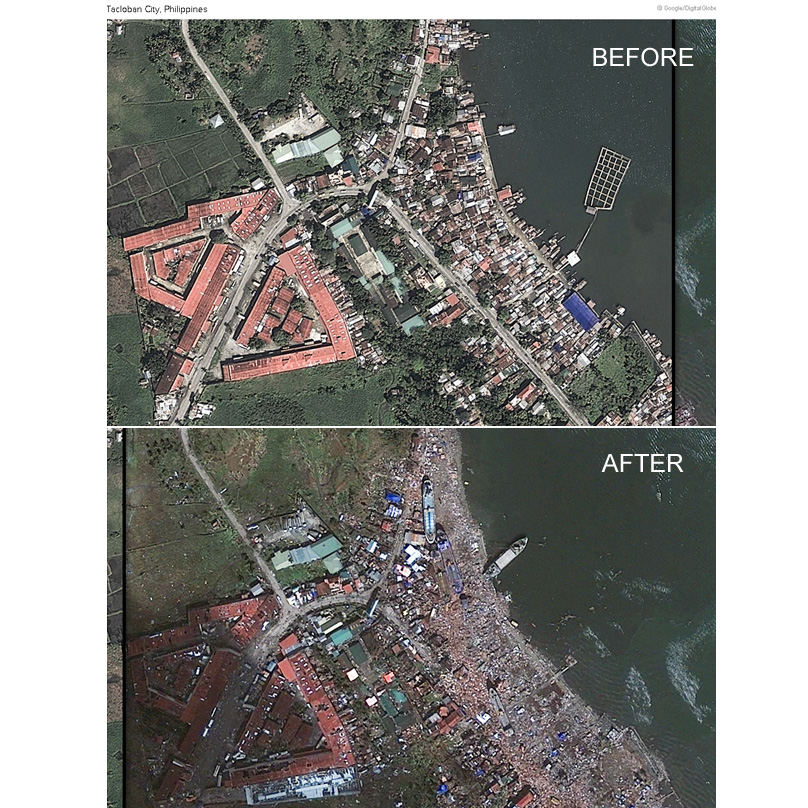 But when cycles push in the same direction, the effects are amplified. A storm surge is one example: As they blow across the ocean’s surface, the winds that create waves accelerate during a storm, causing the cycle of ocean waves to have far greater wave heights. These waves combine with the high tide waters of the tidal cycle, and a storm surge ensues with sometimes devastating results, such as the damage at Tacloban from Typhoon Haiyan: