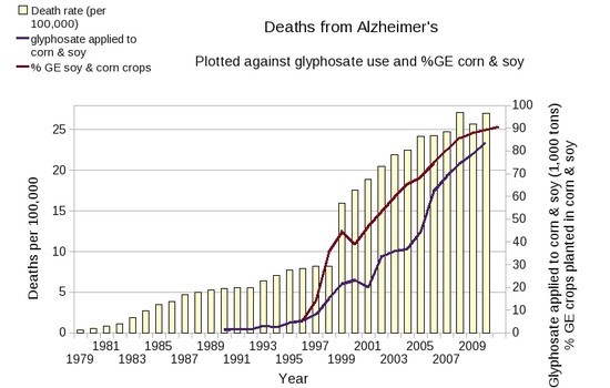OK, this stuff is everywhere (more on that below). But so what. Monsanto says it’s harmless to people and animals. For anyone who might believe that, please carefully check these charts from this report which show a very high correlation between the rise in the tonnage of glyphosate used in the US with the rises in autism, death from Alzheimer’s, and death from senile dementia:Glyph_autism