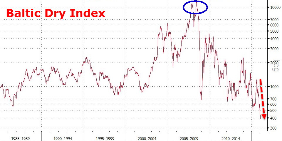 Our last post described–with world trade volume collapsing–how inexpensive it has become to ship things around the globe, leading to this: